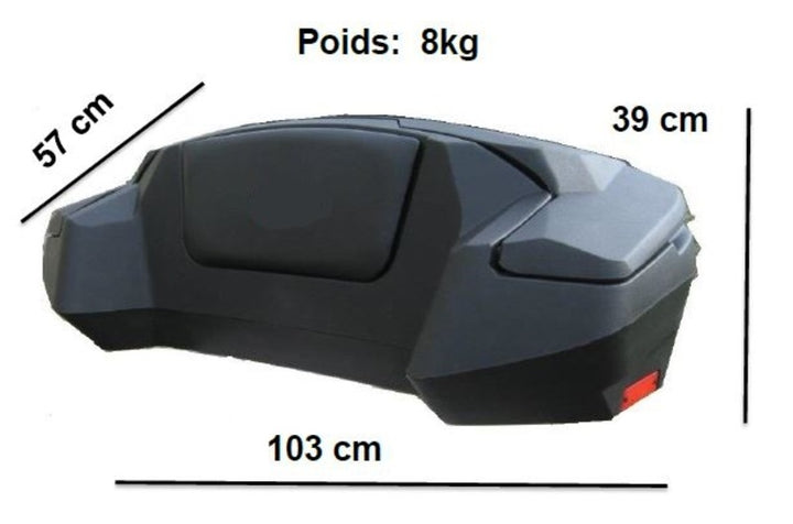 A Strong High Capacity Storage Box. If you need a cargo box with extra storage room, this is the box for you. It Mounts Easily with the «U» Bolt Mounting Kit (Included). Made in Canada Color: Black Heigth_cm: 40.0 Length_cm: 100.0 Luggage_capacity_L: 109 Width_cm: 58.0