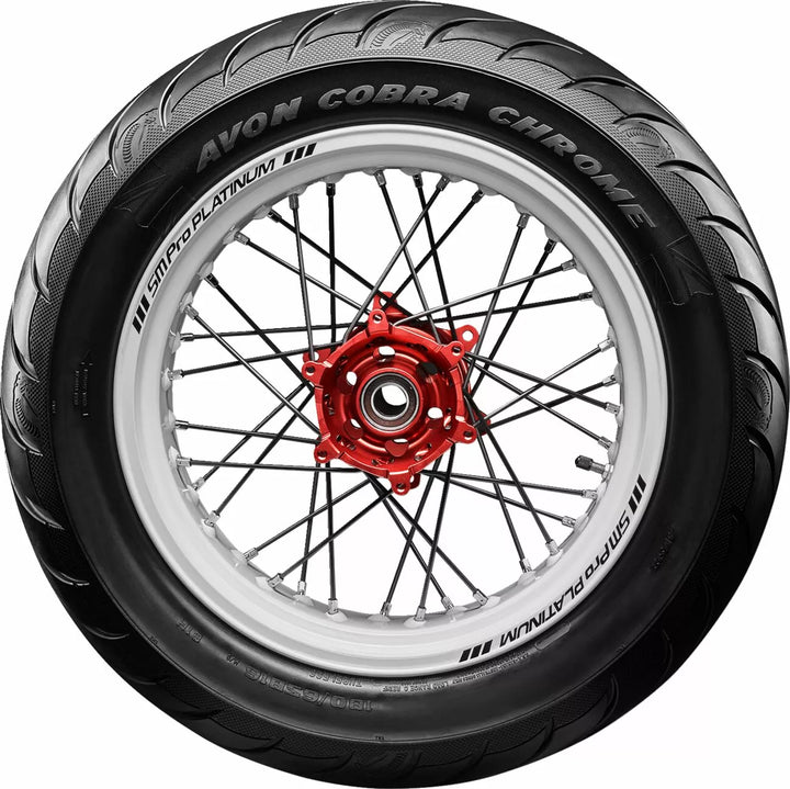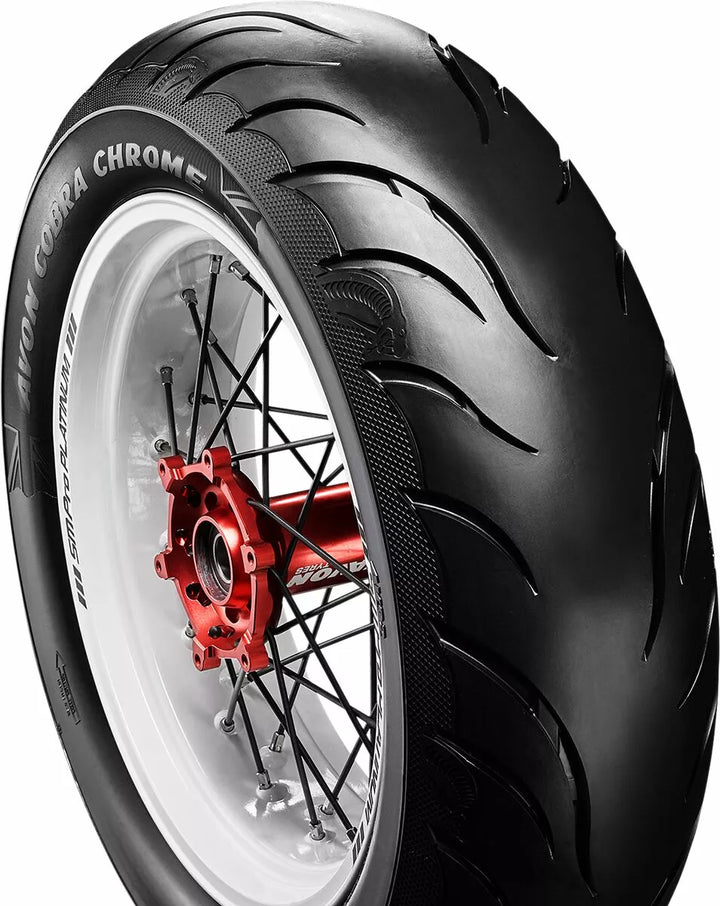 Avon's Latest Tech Pattern and Advanced Construction Produces Over A 5% Larger Footprint Compared To Avon Cobra, High Stability In All Conditions Deliveness Precise Feel and Tire Feedback, Better Traction and Shorter Stopping Distances, Even in the Wet, Incorporates Sports Tirive Longevity-Perfect for Touring, Unique Tire Design with Detaileled Aesthetic Features, Improved Tire Life Over ITS Precessor, Snakeskin-Effect Treat, Reinforced, Aimed at the Power Cruiser/Touring/Custom Market.