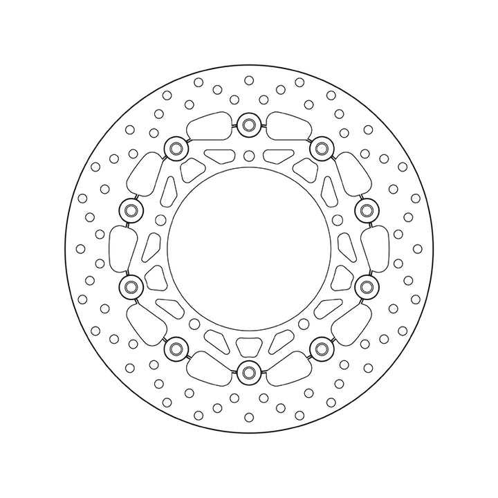 Brembo Serie Oro brake discs represent the best that the market has to offer, with a range of products boasting superlative technical content and quality. Available in both fixed and floating versions, these discs are fully interchangeable with original production discs. Floating discFloating discs are made from only the highest quality materials available to deliver unparalleled performance These consist of a braking rotor in stainless steel, connected by 10 fastener screws to an anodised aluminium alloy hat. Highers braking power Quality and performance guaranteed Efficient in all weather conditions : heat, rain, cold… Brake Disc Shape: Round Disc Type: Floating Hole Diameter (mm): ø 8.5 Inner Diameter: ø 132 Number of Holes: 5.0 Outer Diameter: ø 298 Thickness (mm): 5 mm
