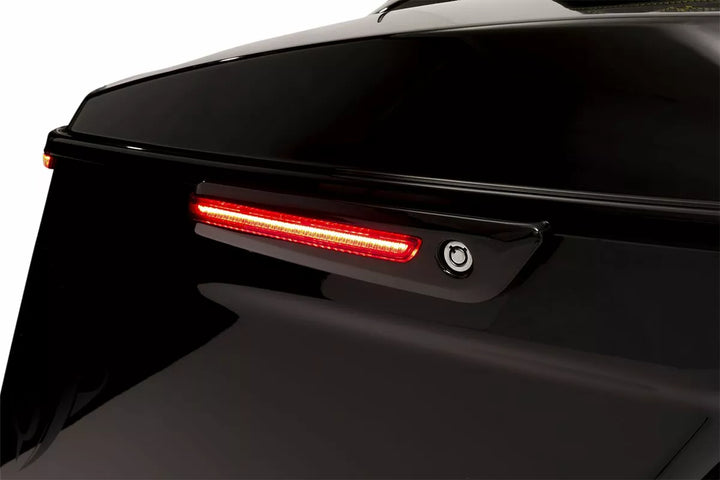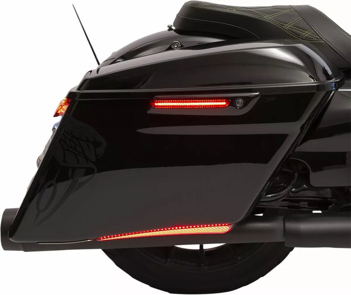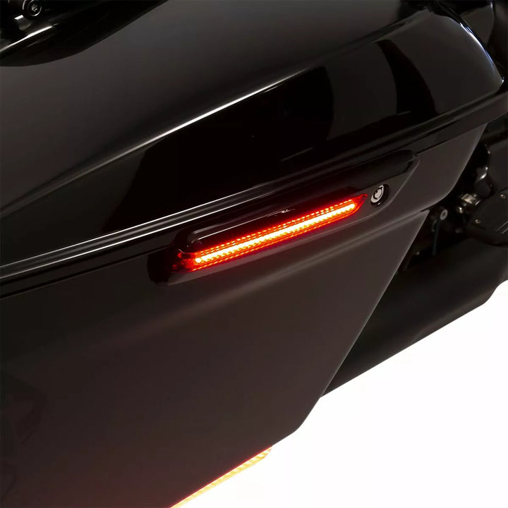 Replaces the hinge cover and reflector to transform the look of your saddlebag, Made of aluminum with Shatterproof polycarbonate lenses, Red run, turn and brak lights, quick disconnect, plug-and-play harness for easy saddlebag
