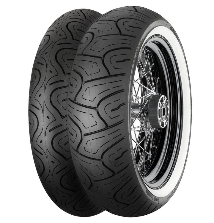 Classic custom whitewall tire for cruisers and heavy touring bikes. Unique pattern design with whitewalls to support the classic look of touring bikes. Specially for heavy touring bikes, cruisers, and Harleys® engineered carcass construction for easy handling, solid behavior, and a high level of comfort. The MileagePlus Technology features a compound that significantly extends mileage while maintaining exceptional handling. Multi-grooved pattern for optimal drainage. Consistent performance during tire lifetime. Aspect_ratio: 80.0 Markings: Whitewall Position: Front Rim_diameter: 17 Speed_index: H < 210 km/h Tire_category: Custom bikes Tire_family: Motorcycle & Scooter Tires Tire_load_index: 65.0 Tire_pattern: CONTILEGEND Tire_Structure: X-Ply Tire_width: 130 Tubeless_or_Tubetype: TL - Tubeless
