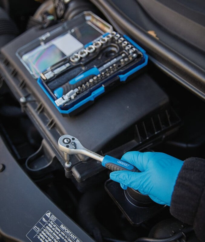 This 1/4 "sq. Dr. Socket Set Includes A 146mm 72-TOOD REVERSIBLE Quick-release Ratchet, plus a Selection of Sockets, Screwdriver Bits and Hex Keys. All of the Tools in This Set Are Manufactured A HACE PACES For Extra Grip. The Ratchet and Spinner Both have a Soft Grip for Added Comfort During Prolonged.