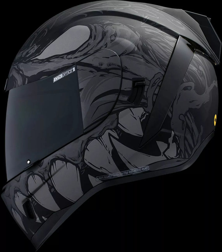 Continuous Venting System, FAG-FREE ICON OPTICS ™ Shield with Rapid-release ™ System, Injection Molded Polycarbonate Shell for Strength, Internal Airflow Geometry, Sculpted NECK Roll, Prolock ™ Switsch, the EXTERIOR WITH LOCKING SHIVING SWEQU Visor must only be used while the main face shield is in the fully closed position, removable Molded Breath Deflector, Removable Hydradry ™ 3-Piece Moisture Wicking Liner, Internal Speaker Pockets Work With Icon's R.A.U. Bluetooth Device, Includes Dark Smoke Dropshield ™ and Rubatone Black Speedfin ™