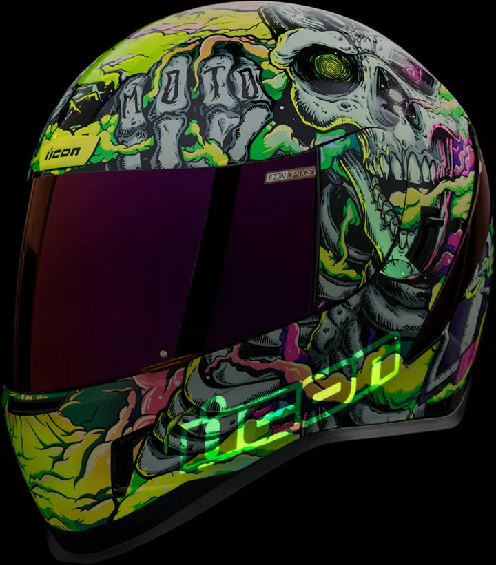 Injection-Molded Polycarbonate Shell for Strength and Durability, Intermediate Headform, Clear Fog-Free Optics ™ Shield Installed, Purple RST FAG-FREE OPTICS ™ Shield Included, Dark Smoke Locking System, PHELOK SHID ™ Removable Comfort Liner, Purple RST Spoiler Kit, Glow in the Dark Graphics, Internal Airflow Geometry, Continuous Venting System, Sculpted NECK Roll, FAG-FREE ICON OPTICS ™ SHIELD IS WITH RAPID-RELEAT The Fully Closed Position, Removable Molded Breath Deflector, Internal Speaker Pocket's Work with Icon's r.a.u. Bluetooth Device