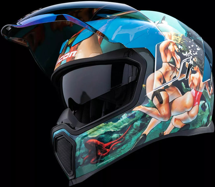 Injection Molded Polycarbonate Shell for Strength, Quick-Change Fog-Free Fliteshield ™ with Sideplates, recessed Twin Channel Supervent Cooling System, Removable Molded Breath Deflector and Chin Curtain, Multiple Oversized Intake and exversized intake. Exterior Switch, The Dropshield ™ Visor Must Only Be Used While The Main Face Shield Is In The Fully Closed Position, Removable Hydradry ™ Moisture Wicking Liner, Internal Speaker Pockets Work With Icon's R.A.U. Bluetooth Device, Includes Clear & RST BLUE FLITESHIELD ™, Includes Dark Smoke Dropshield ™