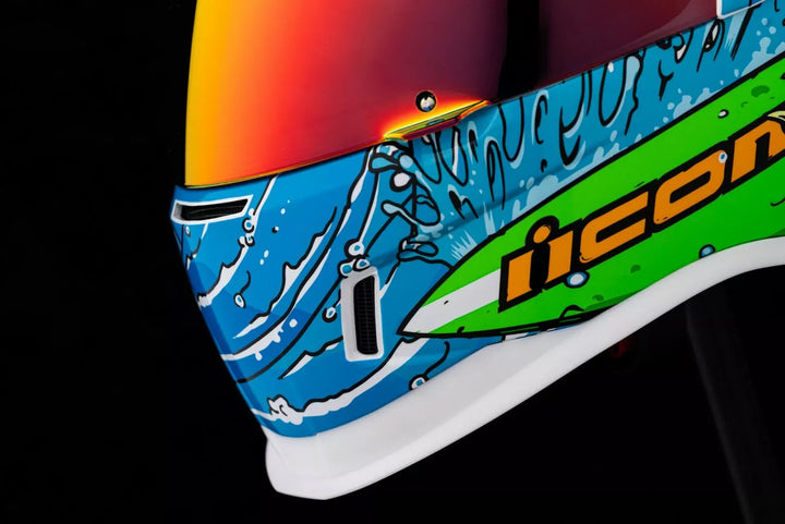 Continuous Venting System, Injection Molded Polycarbonate Shell for Strength, Internal Airflow Geometry, Sculpeed NECK Roll, FAG-FREE ICON OPTICS ™ Shield with Rapid-Rease ™ System, Prock ™ Face Positive Shield Locking System, The Drophield System Shield is in the fully closed position, Internal Dropshield ™ with Exterior Switch, Removable Molded Breath Deflector, Removable Hydradry ™ 3-Piece Moisture Wicking Liner, Internal Speaker Pockets Work With Icon's R.A.U. Bluetooth Device, Includes Clear & RST RED ICON OPTICS ™ Shields, Includes Dark Smoke Dropshield ™