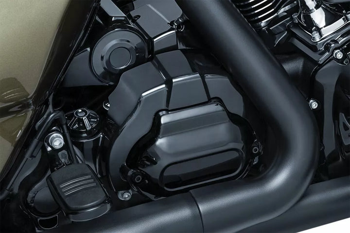 Cover the Wrinkle Black Outs Transmission on Milwaukee-Eight ル Powerplants With a Single-Piece, Bolt-on Design Cast From Quality Aluminum and Form-Fitted to Seamlesly Cover The Outer Casing for A Complete Transformation, Die Restructure Constructs Re-installation of the rear exhaust heat shield