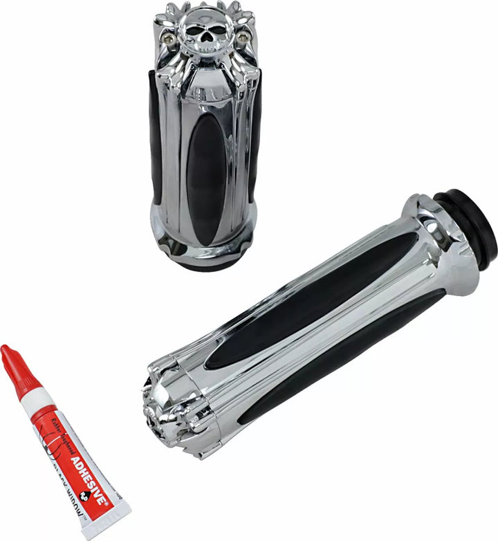 Wicked Looks, Wicked Comfort, Grip Bodies Are Smooth Chrome with Vibration-absorbing Rubber Inserts, Zombie End Caps Enhance The Look, Premium Zombie Grips Include Throttle Boss