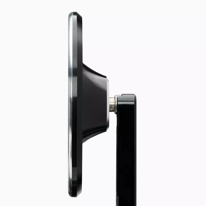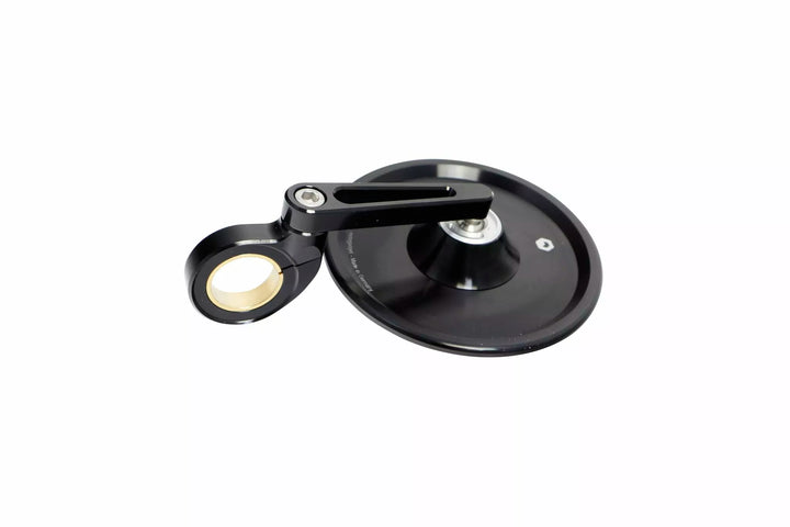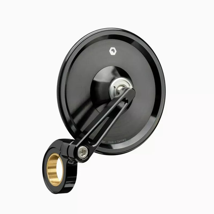 The Handlebar End Mirror in Classic Round Design Can Be Mounted Above or Below the Handlebar. The Angle of the Mirror Arm is Individually Selectable., Our Glasless Mirror Series Mo.view is Unique Worldwide. The Special Feature of Our Mirrors Is The Patented Mirror Surface, Which Is Made Directly From the Metal of the Body. The Aluminum Itself is the Mirror Surface! The Mirror Body Itself is very Thin and Light, Creating a Weightless Design Without A Rim or Frame., The Convex Mirror Surface is produced by Fly Cutting Using Diamond Tools On Ultra-precision Machines in Berlin. It is then made resistant to oxidation, corrosion and abrasion by an elaborate plasma coating in a vacuum., The mirror body, mirror arm and the clamp for the handleable end are milled from solid aluminum on cnc machines and anodized to a high quality. All Screws are Made of Stainless Steel. The precise ball joints the mirror to be adjusted Comfortable and very stable. Glass Breakage or Glass Falling Out is Simply Not Possible!, The Handlebar End Mirror Can Be Mounted Above or Below The Handlebars. , The small arm can be swivelled. The Mirror is suitable for the right and left side. It can be mounted directly on the handleable end (22 mm and 1 inch) or, if the grips and fittings cannot be moved, using the mo.view bar adapter., Diameter of the mirror body: 99 mm., Thickness of the Mirror Body Without Ball Head: Diameter: Can be used for 22 mm and 1 inch handlebars., CLAMP WIDTH: 10 mm., Weight: 125 g., Scope of Delivery: 1x Rear-View Mirror Mo.view Classic 60 (With Ece Marking) With Arm, 1x Clamp & Instructions Manual.