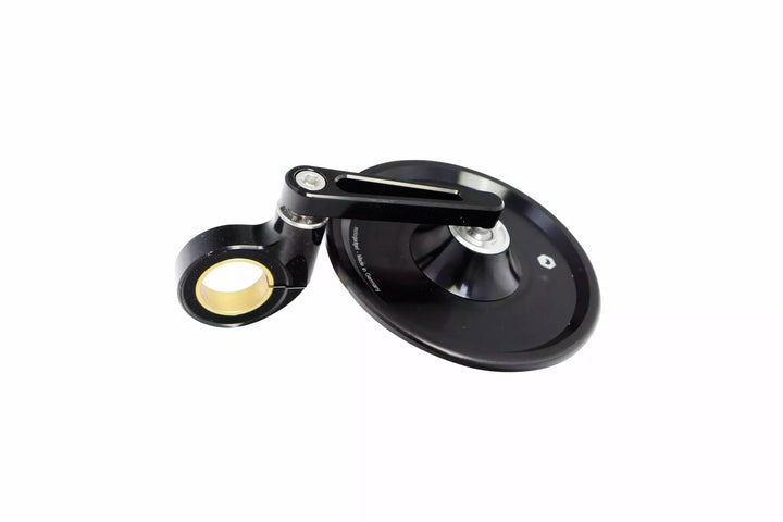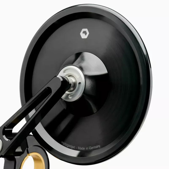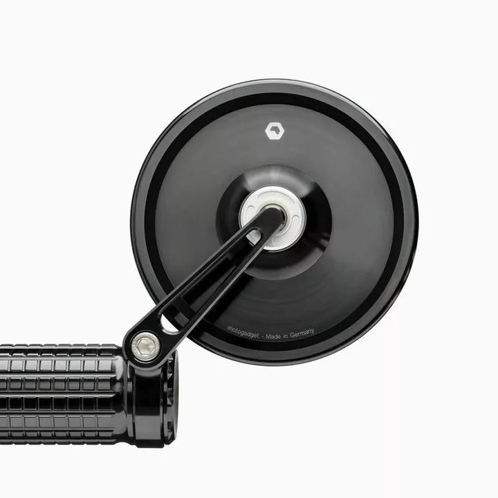 The Handlebar End Mirror with Swivel Mirror Arm and Defined Detent Angles is Perfect for Narrow Passages or Space Problems in the Garage. The Mirror has an Ece Marking and Can Be Mounted Above or Below the Handlebar., Our Glasless Mirror Series Mo.view is Unique Worldwide. The Special Feature of Our Mirrors Is The Patented Mirror Surface, Which Is Made Directly From the Metal of the Body. The Aluminum Itself is the Mirror Surface!, The Mirror Body Itself is Very Thin and Light, Creating a Weightless Design Without a Rim or Frame. The Convex Mirror Surface Is Produced by Fly Cutting Using Diamond Tools On Ultra-precision Machines in Berlin. It is then made resistant to oxidation, corrosion and abrasion by an elaborate plasma coating in a vacuum., The mirror body, mirror arm and the clamp for the handleable end are milled from solid aluminum on cnc machines and anodized to a high quality. All Screws are Made of Stainless Steel. The precise ball joints the mirror to be adjusted Comfortable and very stable. Glass Breakage or Glass Falling Out is Simply Not Possible!, A Special Feature of the Flip Series Mirrors Is The Pivoting Mirror Arm With Defined Locking Angles at 45 ° Intervals. This Allows the Mirror to Be Tilted Upwards As Required Without Changing the Mirror Setting., Extremely Practical for Narrow Passages, Space Problems in the Garage or for Transportation. The Locking Mechanism is Very Stable and Cannot Be Adjusted Accidentally. The Mirror does Not Vibrate, Even at High Speeds, IF Fitten Correctly., The Mirror Can Be Mounted Either Above or Below the Handlebars and Is Suitable for the Right and Left Side. It is mounted directly on the handleable end (22 mm and 1 inch) or, if the grips and fittings cannot be moved, using a mo.view bar adapter., Diameter of the mirror body: 99 mm., Thickness of the Mirror Arm: 7, Length of Head: 4.2 mm. Can be used for 22 mm and 1 inch handlebars., CLAMP WIDTH: 12 mm., Weight: 150 g., Scope of Delivery: 1x Rear-View Mirror Mo.view Classic 60 Flip (with ece marking) With arm, 1x Clamp & Instructions Manual.