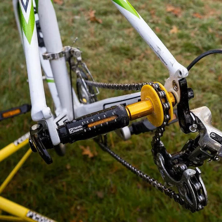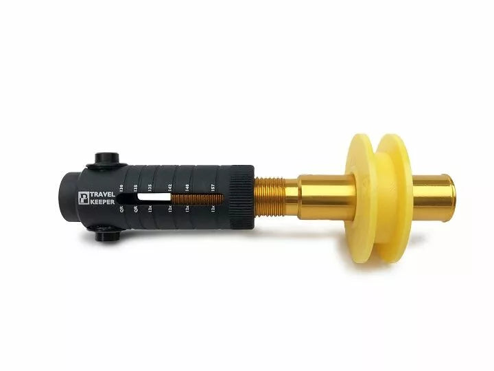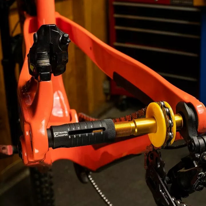 Wheel Placeholder for Cleaning and Frame Protection During Travel., The Travel Keepel is equally at Home Protecting a Frame's Rear Triangle During Travel or Providing Full Chain Keeper Functionality. , Adjustable Design Fits All Sear QR and 12mm Thru Axle Frames and Features Aluminum Construction, Shifting Across All Gears, and Heavy-Duty Solvent Resistant Plastic Pulley., Structural Support Red Dropouts for Maximum Frame Protection Durition Durring TRAVEL. Shifting through Full Range of Gears., Adjustable Design Fits 130 and 135 QR Dropouts and All 12mm Thru Axle Frame Up To 12x157., Professional Grade Aluminum and Solvent Resistant Plastic Components Ready for Daily Life in the Wash Bucket or