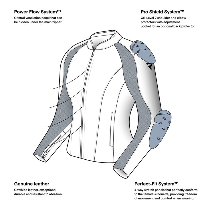 The minimalist design makes Siena to A stylish choice for all types of motorcycles, at the same time as it High security level with CE Level 2 protection at shoulders and elbows Guarantees security on the roads.