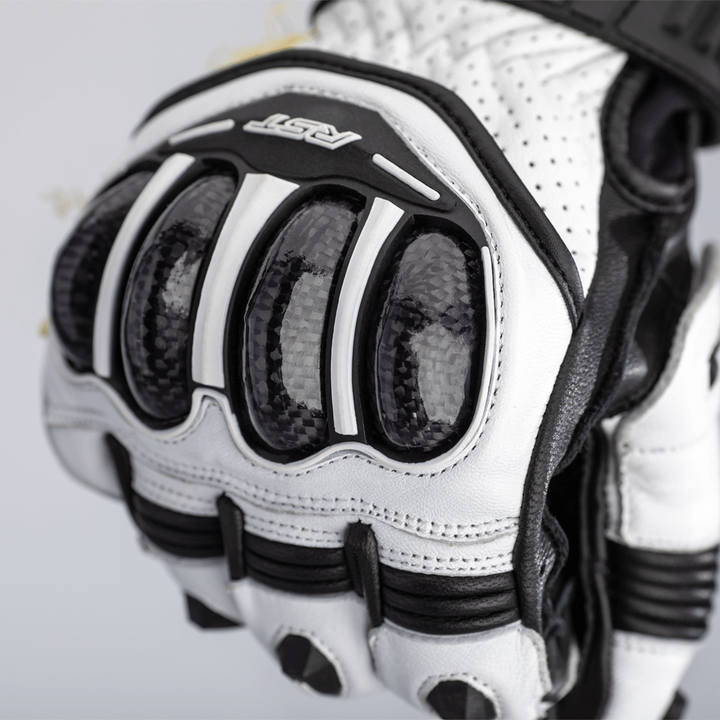 The glove is made of both whole grain's cowhide and kangaroos and has a CE level 1 Carbon Knuckle Protector for shock protection. DUPONT ™ Kevlar® fiber on palm and substrate, together with double layer kangaroos and an RST palm control protects the palm in the event of high-speed slide. Elastic joined fingers to prevent "finger roll" without affecting range or flexibility when replacing gear and hook and loop closure provides a safe fit.