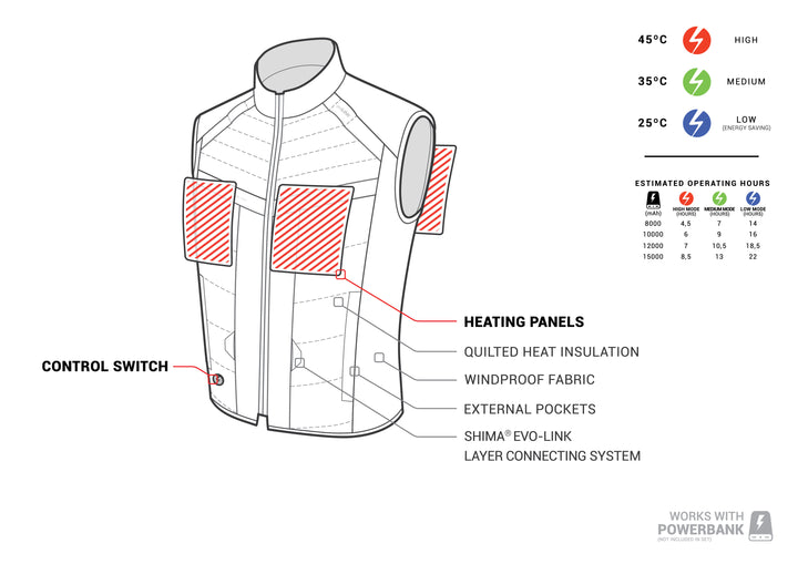 Shima powerheat Provides comfort when standard insulation is not enough. The electric vest is heated by special panels placed in important locations to ensure optimal temperature for the body. The product is intended to be used with Power Bank, which can easily be connected to a USB cable hidden in a dedicated pocket.