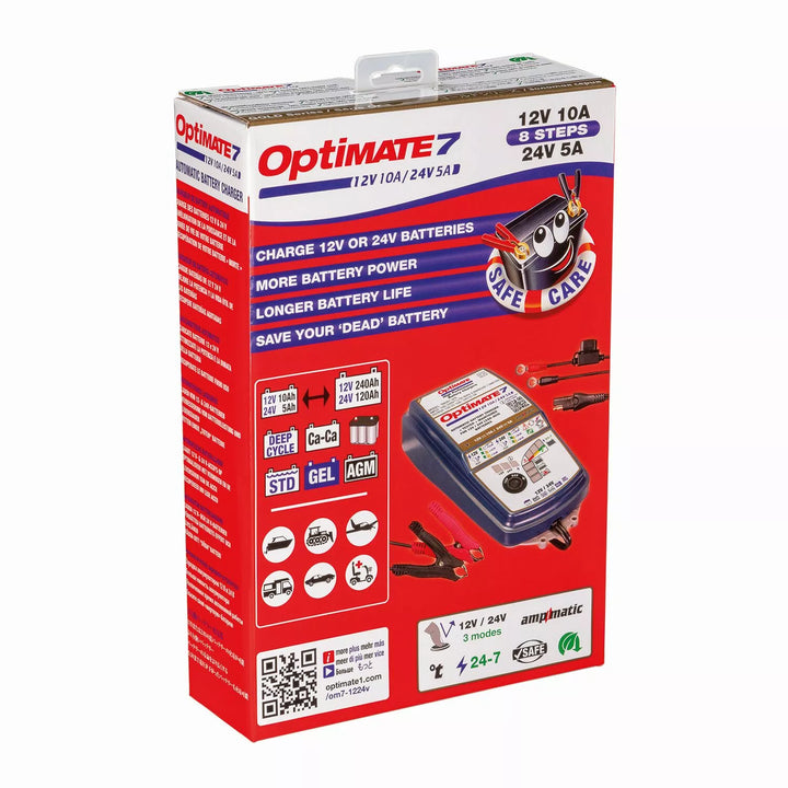 OPTICATE 7 12V / 24V GOLD Series: 8-Step 12V 10A / 24V 5A Sealed Battery Saving Charger & Maintainer., The Advanced Battery Charger for the 12V or 24V DEEP CYCLE LEAD-ACID BATTERY IN YOUR BATEMENTS Performance!, Ideal for 12V and 24V Deep Cycle and High Performance Marine / Dual-USE Lead-Acid Batteries., Select the Right Charge Voltage For Your Deep Cycle or Marine / Dual use 12V or 24V Lead-acid Battery, Gelud. Selection Remains in Memory Even IF AC Power is Lost., Fully Automatic Multi-Step Program Brings The Battery Safely to Full Charge. Connect to the Battery and Optime 7 12V-24V BRINGS YOU BATTERY TO A TRUE 100%, No Supervision Required!, Ampmatic: Automatically Adjusts Current to Match Battery Size and Condition., Temperature Compensation: Voltage is adjust. Full Electronic Protection., Maints Battery at Full Charge and Good Health., Saves Your 'Dead' Battery From As Low As 0.5v., S.O.H.: Tests Battery State of Health., Voltage DOE SAFETY Check Requires User Confirmation., Green Technology: 50% LESS Energy, 50% Lower Cost. Power Factor Correction and Synchronous Rectification., IP54: Weatherproof. Rated for use down to -40 ° C / -40 ° f.