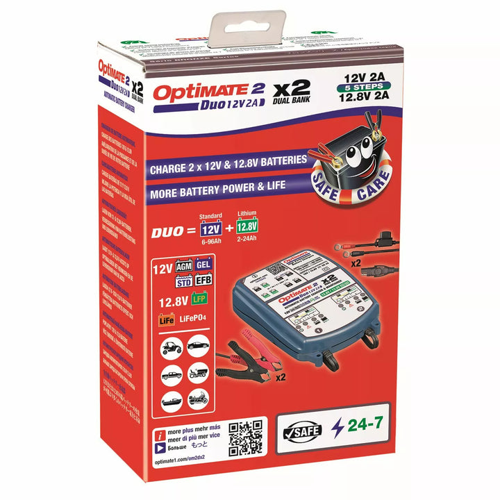OPTICATE 2 DUO X 2 Bank Bronze Series: 5-STEP 12V / 12.8V 2A Sealed Battery Maintainer X2., The Powerful 'No Brain' 2-Bank Battery Mainainer for the Hi-Technology Battery In any of your Vehicles. Guarantees Healthy Lithium or Lead-Acid Battery!, Ideal for 2x 12V Lead-Acid & 12.8V / 13.2V Lithium LFP (LifePo4) Batteries., Independently Charge, Test and Maintain 2 x 12V LEAD LAG (STD, GEL) Batteries. Batteries are Always Ready to Perform., Delivers 2 Amps Charge Current Recommended for Maintenance of Larger Batteries., Charges and Delivers Long Term Maintenance. Connect to the Battery and Optime 2 Duo Dual Bank does the Rest, No Supervision Required!, DUO: Adapts Automatically to PB or LFP Battery., Safe to Leave Connected. Full Electronic Protection., 24/7: Maintains Battery at Full Charge and Good Health., Low Volt Start of 4v., Warn Battery Damage is detected., Green Technology: Energy Saving Technology. Stand-by Power Less Than 0.5W and Efficient 24-7 Battery Maintenance., IP54: Weatherproof. Rated for use down to -40 ° C / -40 ° f.