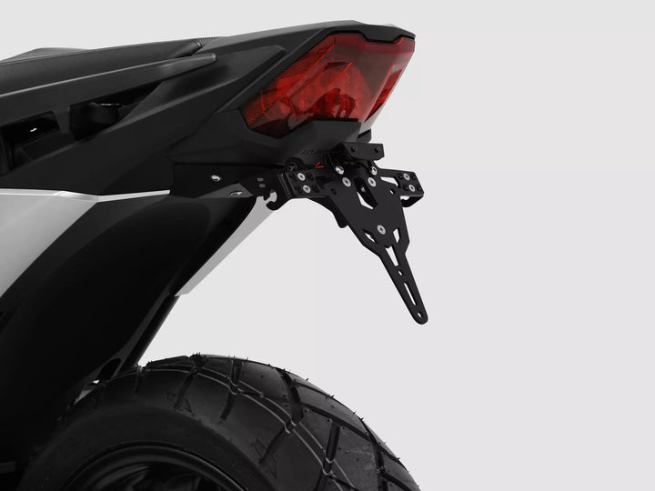 The License Plate Holder is Extremely Durable and Weather Proof., Black Powder Coated. , The License Plate Holder Can Be Used For Any Kind of License Plate (175mm Width)., No Modification of Fairing Required., Stepless Adjustment of Rake Angle., Indicator Support Adjustable in 3 Positions. Plate., Special Indicator Light Mounts (Sold Separately) Required for Stock Indicator Lights., Kit Includes: 1 License Plate Holder Incl. Mounting Kit., LED License Plate Light "e Approved" Incl. Support., Back Light With Support.