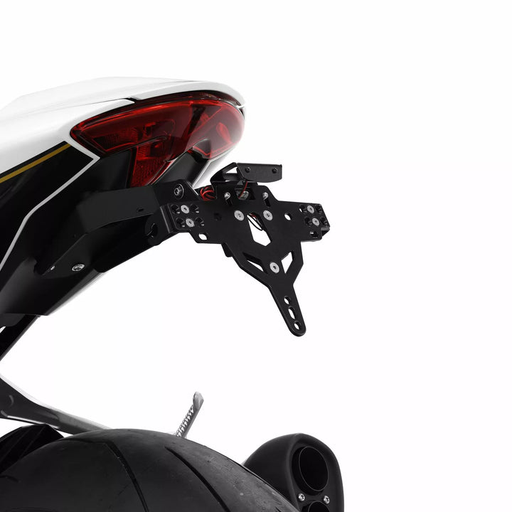 The License Plate Holder is Extremely Durable and Weather Proof., Black Powder Coated. , The License Plate Holder Can Be Used For Any Kind of License Plate (175mm Width)., No Modification of Fairing Required., Stepless Adjustment of Rake Angle., Indicator Support Adjustable in 3 Positions. Plate., Special Indicator Light Mounts (Sold Separately) Required for Stock Indicator Lights., Kit Includes: 1 License Plate Holder Incl. Mounting Kit., LED License Plate Light "e Approved" Incl. Support. Of: Switzerland, Poland and Ireland.