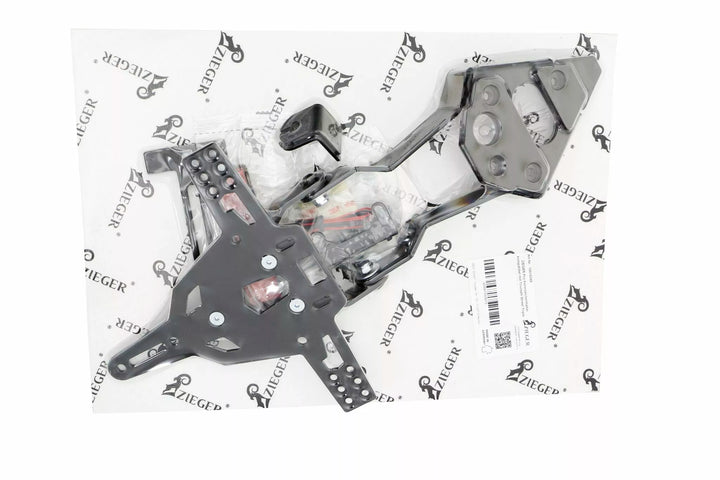 The License Plate Holder is Extremely Durable and Weather Proof., Black Powder Coated. , The License Plate Holder Can Be Used For Any Kind of License Plate (175mm Width)., No Modification of Fairing Required., Stepless Adjustment of Rake Angle., Indicator Support Adjustable in 3 Positions. Plate., Special Indicator Light Mounts (Sold Separately) Required for Stock Indicator Lights., Kit Includes: 1 License Plate Holder Incl. Mounting Kit., LED License Plate Light "e Approved" Incl. Support., Back Light With Support.