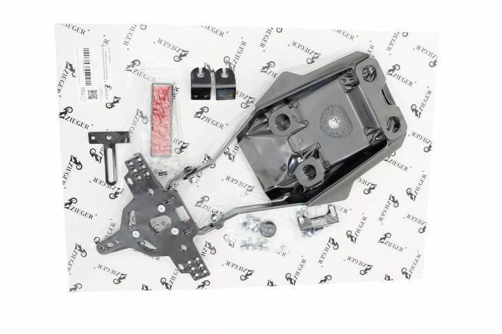 The License Plate Holder is Extremely Durable and Weather Proof., Black Powder Coated. , The License Plate Holder Can Be Used For Any Kind of License Plate (175mm Width)., No Modification of Fairing Required., Stepless Adjustment of Rake Angle., Indicator Support Adjustable in 3 Positions. Plate., Special Indicator Light Mounts (Sold Separately) Required for Stock Indicator Lights., Kit Includes: 1 License Plate Holder Incl. Mounting Kit., LED License Plate Light "e Approved" Incl. Support. Of: Switzerland, Poland and Ireland.