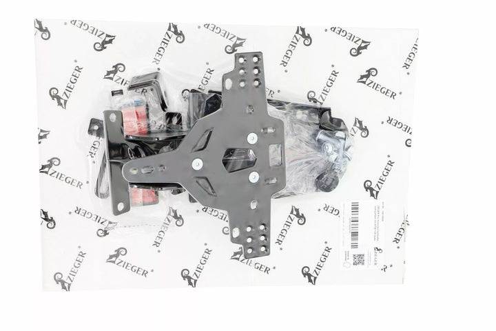 The License Plate Holder is Extremely Durable and Weather Proof., Black Powder Coated. , The License Plate Holder Can Be Used For Any Kind of License Plate (175mm Width)., No Modification of Fairing Required., Stepless Adjustment of Rake Angle., Indicator Support Adjustable in 3 Positions. Plate., Special Indicator Light Mounts (Sold Separately) Required for Stock Indicator Lights., Kit Includes: 1 License Plate Holder Incl. Mounting Kit., LED License Plate Light "e Approved" Incl. Support. Of: Switzerland, Poland and Ireland.