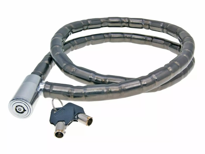 Bardzo solidny zamek łańcucha pancernego z elastyczną gumową powłoką. , Długość 1,20 m / średnica ok. 18 mm. , Klasyk wśród blokad na dwumieszce, dostarczany z 2 klawiszami.
