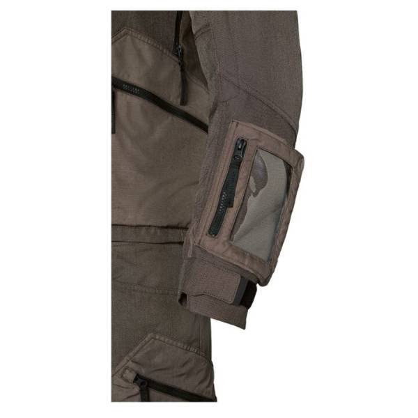 Kurtka jest wykonana w jednym Niezwykle trwały i wentylacyjny tkanina wysięgnika poliamidu, co czyni go zarówno trwałym, jak i wygodnym w cieplejszych temperaturach. Za deszcz i zimno zawierały osobne Wodoodporna zewnętrzna kurtka Gore-Tex® (Wodoodporny 28 000 mm), który można łatwo wyciągnąć na zewnątrz, aby zapewnić pełną ochronę przed wiatrem i mokrym.