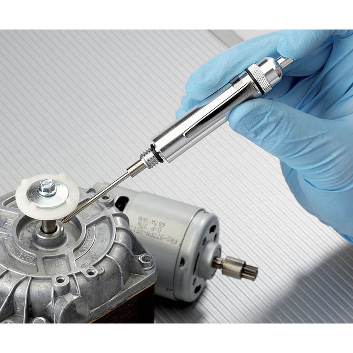 Wypolerowane aluminium ze stalowym klipsem do kieszeni. Zaprojektowany do przypominania smarowania do małych i niezręcznych obszarów. Igła aplikatora o długości 40 mm z mosiężnym przyciskiem sterowania przepływem do drobnej kontroli. Wyświetlacz zapakowany. Długość 145 mm