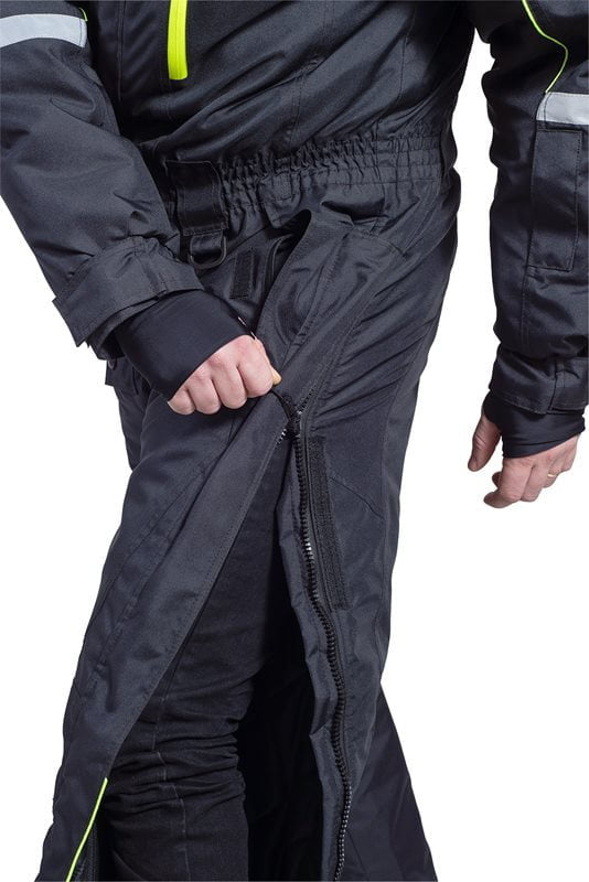 Ma odpinany kaptur, dobry zamek przeciwśnieżny przy końcu nogawek oraz zamek błyskawiczny od kostek do bioder, aby pomieścić buty i ułatwić zakładanie.