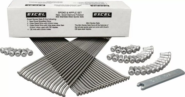 Zestaw obejmuje wysoce wypolerowane 302 szpryki ze stali nierdzewnej o średnią wytrzymałości na rozciąganie o 10% wyższą niż szprychy OEM