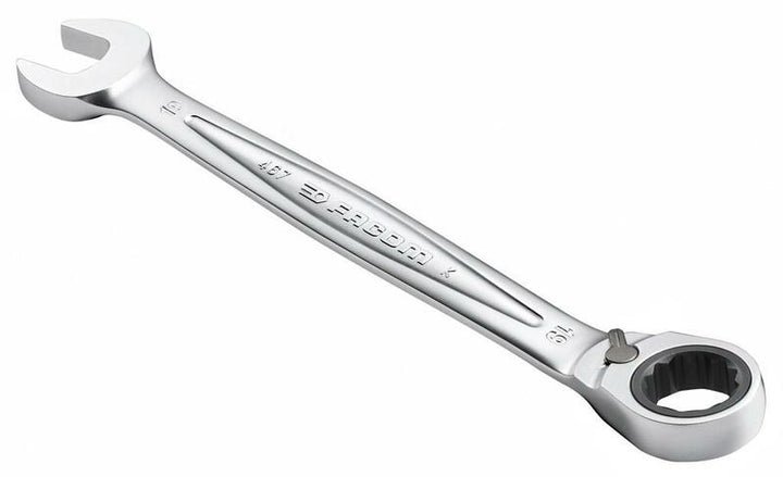 Ratchet Combination Wrenches Series 467 dla wszystkich aktualnych aplikacji. Kompaktowy mechanizm zapadkowy i odwracalny przez wątrobę. Satynowy Chrome Wykończenie 12 -punktowy pierścień punktowy pod kątem 15 ° i 5 ° Sopen End Head pod kątem 15 °