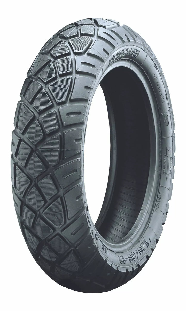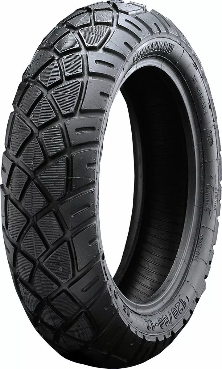 Czterosezonowa opona skutera, zmodyfikowana ze standardowych K58 dla zastosowań o różnych rozmiarach, otwarte bloki oczyszczania do doskonałego drenażu, doskonałe przyczepność, nawet gdy mokra, bezdętkowa (TL), Blackwall, M ocena prędkości dla prędkości do 130 km/h (81 mph).