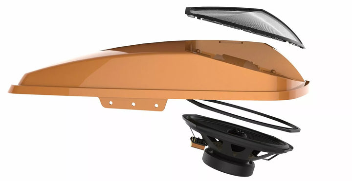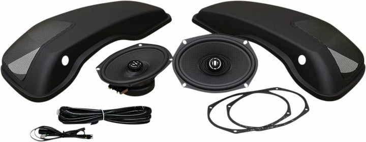 SPEAKERS Angled Toward Rider for Best Sound, Includes 200 Watt 2 Ohm XL Series 6x9 ヤ Speakers Made for Motorcycle Environment, Speakers Feature Carbon Fiber Woofer Cones, Better Bass Response and Allows for Higher Power High Quality) Factory Latch/Lock Mechanism Bolts Into New Lids, Built-in Water Drainage System Keeps Everything Dry, Comes Matte Black, Primed and Ready For Paint, Metal Mesh Grills, Gaskes, Grommets, Wire Harness and All Wymaga sprzętu jest włączającą wzmacniacz hogtunes lub inny wzmacniacz, wymagany jest wzmacniacz do prawidłowego działania