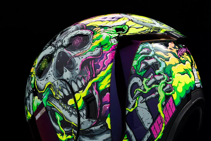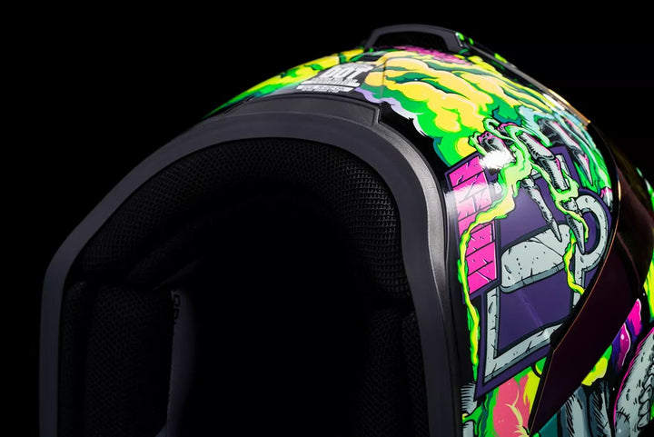 Zatrudniona wtryskowa powłoka poliwęglanowa do wytrzymałości i trwałości, pośrednia forma głowicy, instalowana tarcza optyki bez mgły, fioletowa tarcza optics ™, w tym system blokowania dymu, system wentylacyjny Phelok SHID ™, Roll SHID ™, SCILPTED SHIRK, FULLE RST SPOULER ZAKŁADNIK OPTICS ™ Shield ma szybką pozycję w pełni zamkniętą pozycję, zdejmowany uformowany deflektor oddechu, pracą wewnętrzną kieszonkową z ikonami R.A.U. Urządzenie Bluetooth