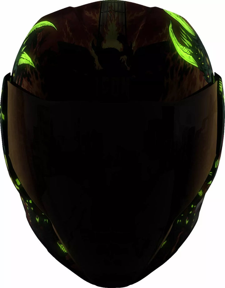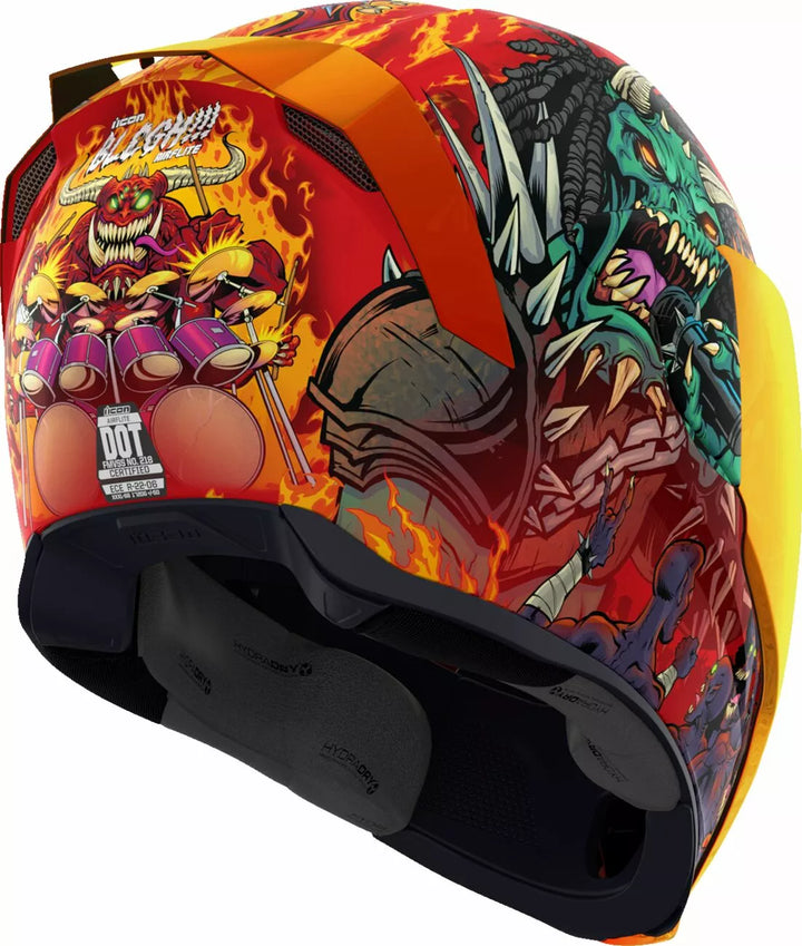 Zdejmowany uformowany deflektor oddechowy i zasłona podbródka, wtryskowa poliwęglanowa skorupa poliwęglanowa dla wytrzymałości, FAG-FAG Dropshield ™ z przełącznikiem zewnętrznym, systemu chłodzenia podwójnego kanału podwójnego, wielokrotne płytki boczne portów spożywczych, Dropshield ™ Visor musi być używany tylko, podczas gdy główna tarcza twarzy znajduje się w całkowicie zamkniętej położe Icon's R.A.U. Urządzenie Bluetooth, zawiera Clear & RST Sunset Fog FliteShield