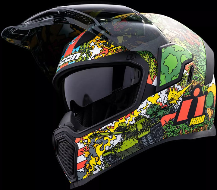 Szybka zmiana FLITESHLIELD ™ z płytkami bocznymi, wtryskową poliwęglanową powłoką dla wytrzymałości, wielokrotne porty spożycia i wydechu, bez mgły Dropshield ™ z przełącznikiem zewnętrznym, usuwaniem, zdejmowaną formą. System chłodzenia nadzoru, wewnętrzne kieszenie głośników współpracują z R.A.U icon's R.A.U. Urządzenie Bluetooth, wizjer Dropshield ™ musi być używany tylko podczas gdy główna tarcza twarzy znajduje się w pełni zamkniętej, zdejmowanej liniowcu wilgoci Hydradry ™, zawiera Clear FliteShield ™ i Dark Smokes Deps.