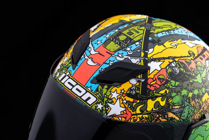 Szybka zmiana FLITESHLIELD ™ z płytkami bocznymi, wtryskową poliwęglanową powłoką dla wytrzymałości, wielokrotne porty spożycia i wydechu, bez mgły Dropshield ™ z przełącznikiem zewnętrznym, usuwaniem, zdejmowaną formą. System chłodzenia nadzoru, wewnętrzne kieszenie głośników współpracują z R.A.U icon's R.A.U. Urządzenie Bluetooth, wizjer Dropshield ™ musi być używany tylko podczas gdy główna tarcza twarzy znajduje się w pełni zamkniętej, zdejmowanej liniowcu wilgoci Hydradry ™, zawiera Clear FliteShield ™ i Dark Smokes Deps.