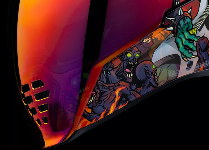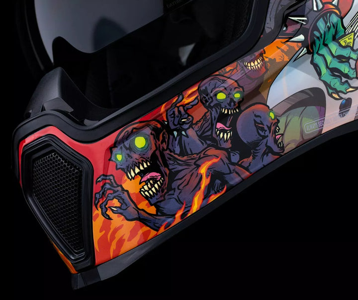 Zdejmowany uformowany deflektor oddechowy i zasłona podbródka, wtryskowa poliwęglanowa skorupa poliwęglanowa dla wytrzymałości, FAG-FAG Dropshield ™ z przełącznikiem zewnętrznym, systemu chłodzenia podwójnego kanału podwójnego, wielokrotne płytki boczne portów spożywczych, Dropshield ™ Visor musi być używany tylko, podczas gdy główna tarcza twarzy znajduje się w całkowicie zamkniętej położe Icon's R.A.U. Urządzenie Bluetooth, zawiera Clear & RST Sunset Fog FliteShield