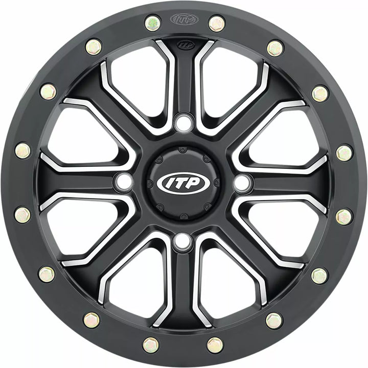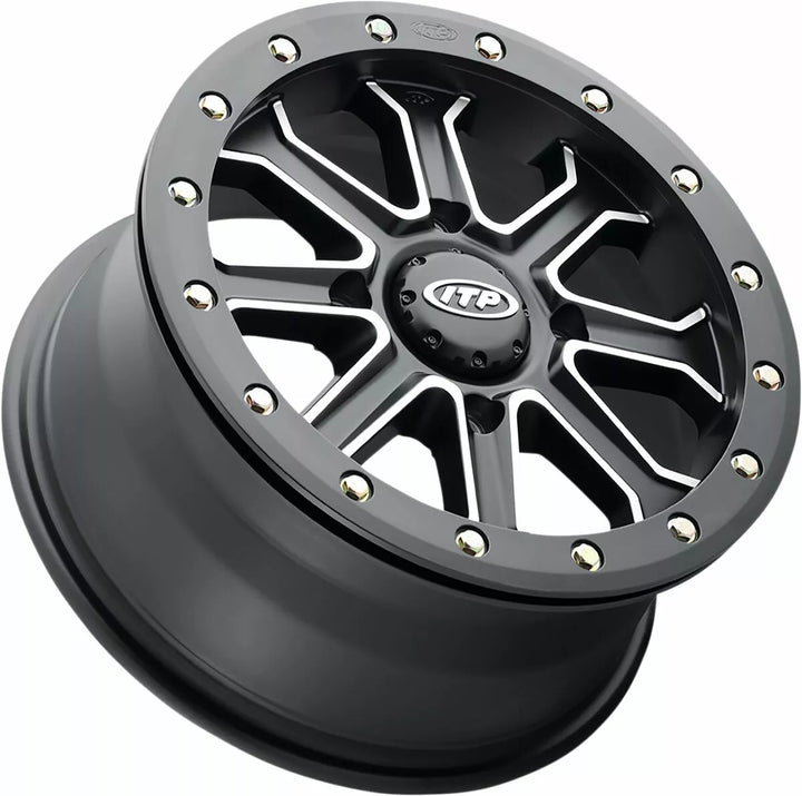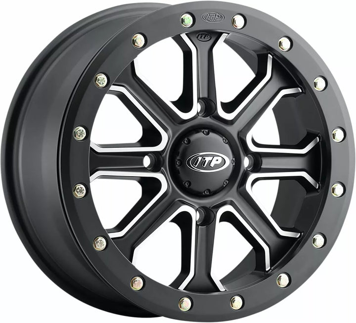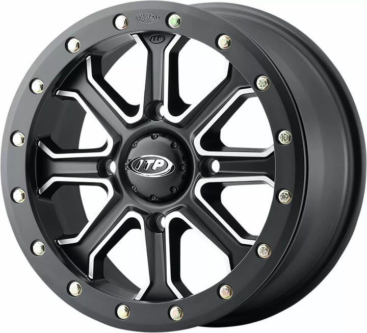 Design Beadlock ubezpieczywa zewnętrzne koraliki, które siedzą w wymagającym środowisku, bliżej offsetów OE dla optymalnych dopasowania i wydajności, ekskluzywna warga wewnętrznego koła ITP, matowe czarne wykończenie z obrabianymi krawędziami, środkową czapką i zaworem, obciążeniem UE,