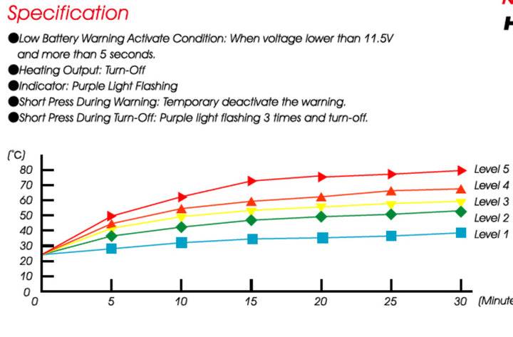 Z Zintegrowany kciuk Czy możesz łatwo dostosować poziom ciepła Nie biorąc za ręce z planszy, który przyczynia się do jednego Bezpieczniejsza jazda. Czysty 5-kolorowy wyświetlacz LED Wyświetla bezpośrednio ustawienie ciepła używane. Ponadto uchwyt jest wyposażony w Ochrona niskiego napięcia, który automatycznie wyłącza ciepło, aby chronić akumulator przy niskim napięciu.