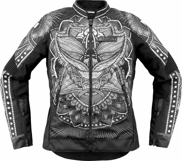Kurtka Women Overlord3 Noble ™ z grafiką Allover wydrukowaną na podwozie z poliestrowym z poliestru i 300D wzmacniacze poliestrowe 300D, sportowy sport ICON® z wstępnie urzeczywanym ramionami i kształtowym korpusem, Certyfikatem D30 Pane Mesh, obrońcy; Ochraniacze uderzenia łokcia i barku, usuwalny izolowany wkładka kamizelki, Protector EN 1621-2 Poziom 1