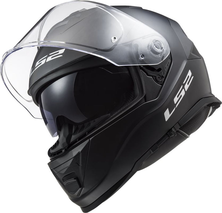 Frontal vy av LS2 Integral Mc-Hjälm Storm II Matt Svart med klar visir och ventilationsöppningar för optimal komfort och säkerhet.
