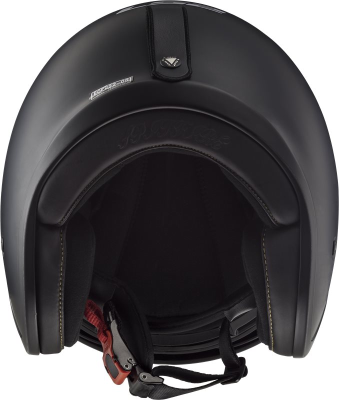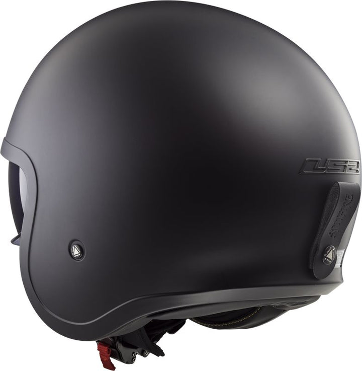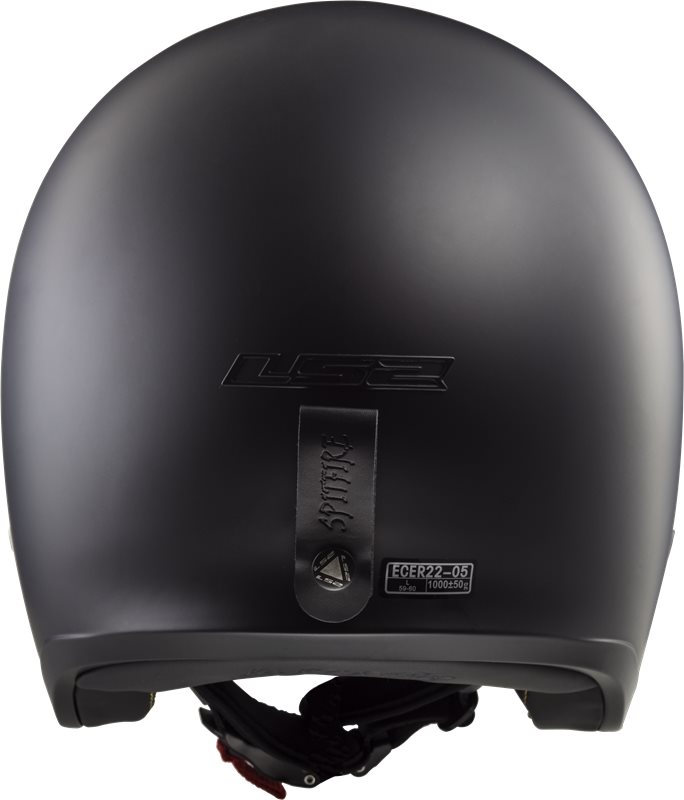 Baksida av LS2 öppen mc-hjälm Spitfire II matt svart med präglad logotyp och ECE-certifiering för säkerhet.