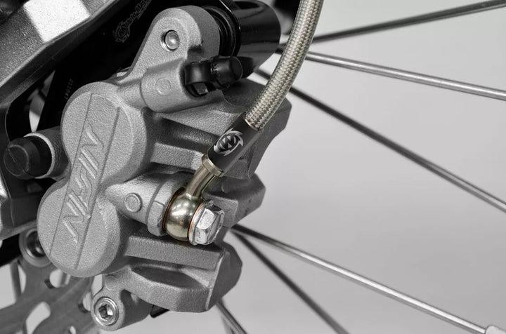PTFE Wąż z przewodowym warkoczem ze stali nierdzewnej, która jest chroniona trwałym i lekkim pokryciem PVC., Banjo ze stali nierdzewnej stosuje się do wyeliminowania wszelkiej możliwej korozji. Instrukcje., Linie hamulcowe plecione ze stali nierdzewnej eliminują to モ gąbczaste ヤ uczucie standardowych plastikowych linii hamulcowych.