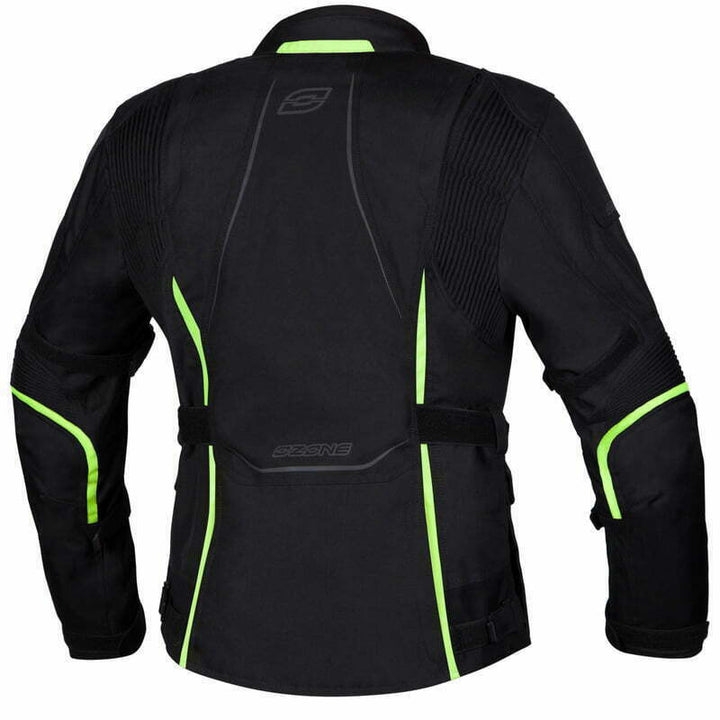 Kurtka turystyczna motocyklowa dla kobiet ma wodoodporną, odpinaną membranę REISSA®, która chroni przed wiatrem i deszczem. Posiada osiem wentylacji z przodu i dwie z tyłu. Ma ochraniacze na łokcie i ramiona w standardzie CE poziom 1 oraz kieszeń z tyłu, w której można dodać ochraniacz.