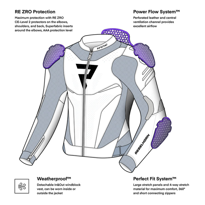 Rebelhorn Inferno to sportowa skórzana kurtka motocyklowa zaprojektowana dla tych, którzy uwielbiają prędkość, krzywe i bezkompromisową ochronę. Jest certyfikowany CE w najwyższej klasie bezpieczeństwa Aaa I zbudowany zarówno dla ulicy, jak i toru. Dzięki kombinacji Miękka skóra orzechowa premium, 4-drogowy materiał rozciągający i jeden Wyjmowana kamizelka wiatru Zapewnia zarówno swobodę ruchu, komfort i ochronę na najwyższym poziomie.
