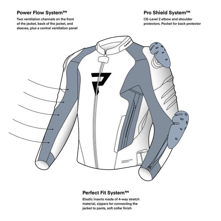 Kurtka motocyklowa Rebelhorn Veloce oferuje, dzięki dobrze przemyślanemu cięciu, komfortowi codziennego użytku i wycieczce dla tych, którzy wolą bezpieczeństwo oferowane przez odzież skórzaną. W połączeniu ze spodniami Veloce tworzy dwuczęściowy kostium. Zastosowanie 4-drogowych wkładek rozciągających zapewnia optymalne dopasowanie. Kurtka ma również zaawansowany system wentylacji.