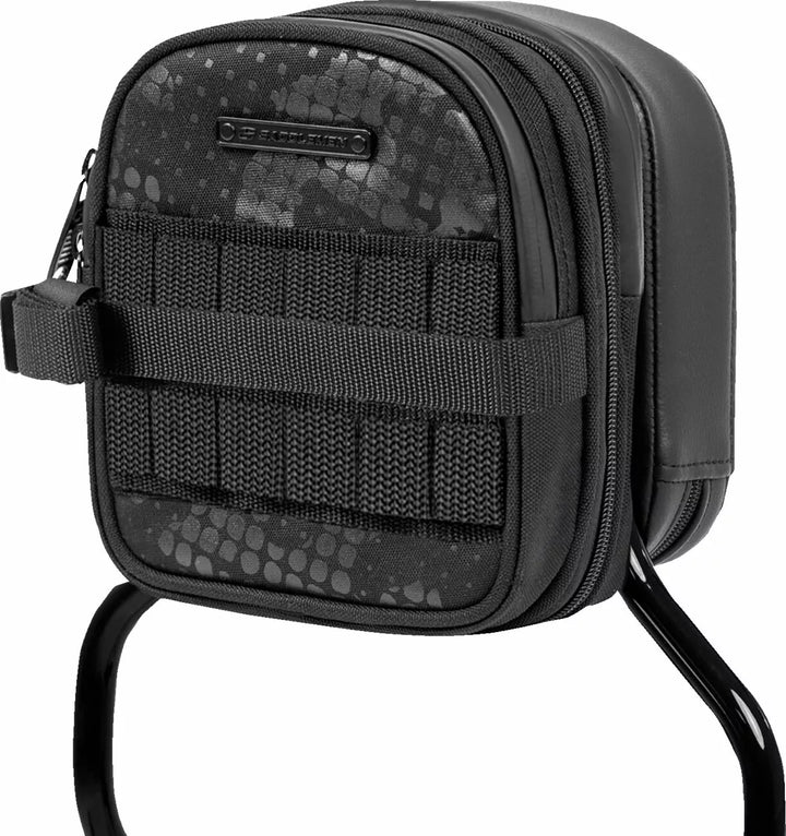 Dogodnie zamontuje się na wsporniku podkładki Sissybar, dwóch kieszeniach zamka, z których jedna rozszerza się, zintegrowane punkty mocowania modułowego Molle do dostosowywania do przechowywania, wszystkie końce paska obejmują nasz unikalny system utrzymania, który eliminuje potrzebę cięcia po zainstalowaniu worka, zbudowanego z UV/wodą i odpornością na pogodę 600 x 600 D printowane poliesterowe, pomiarowe 7 „W (rozszerzone) x 7-1/2”