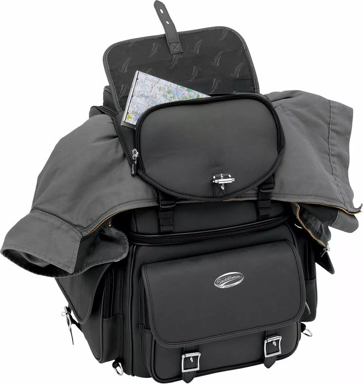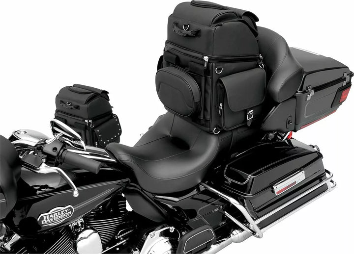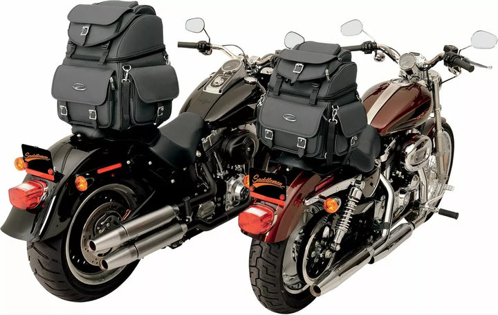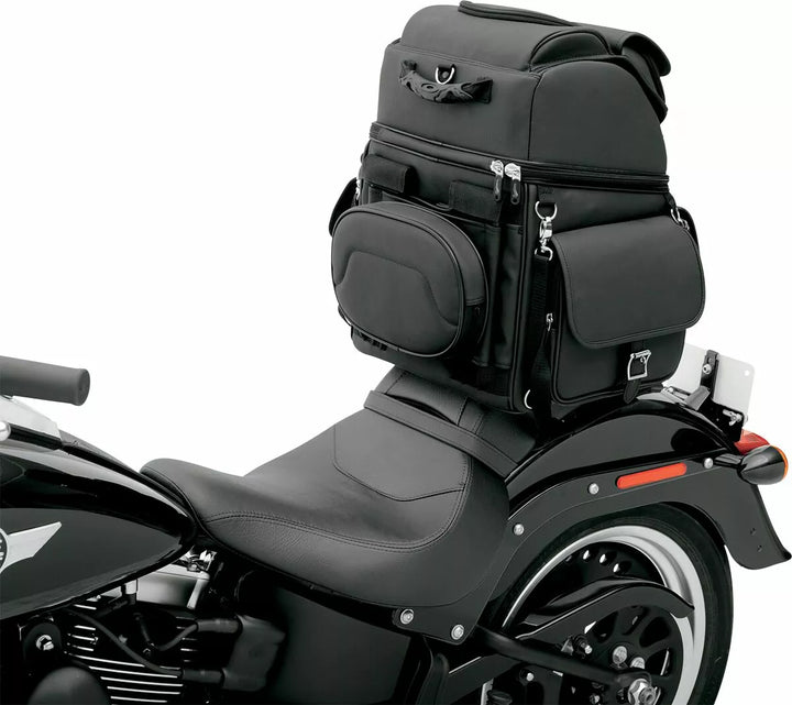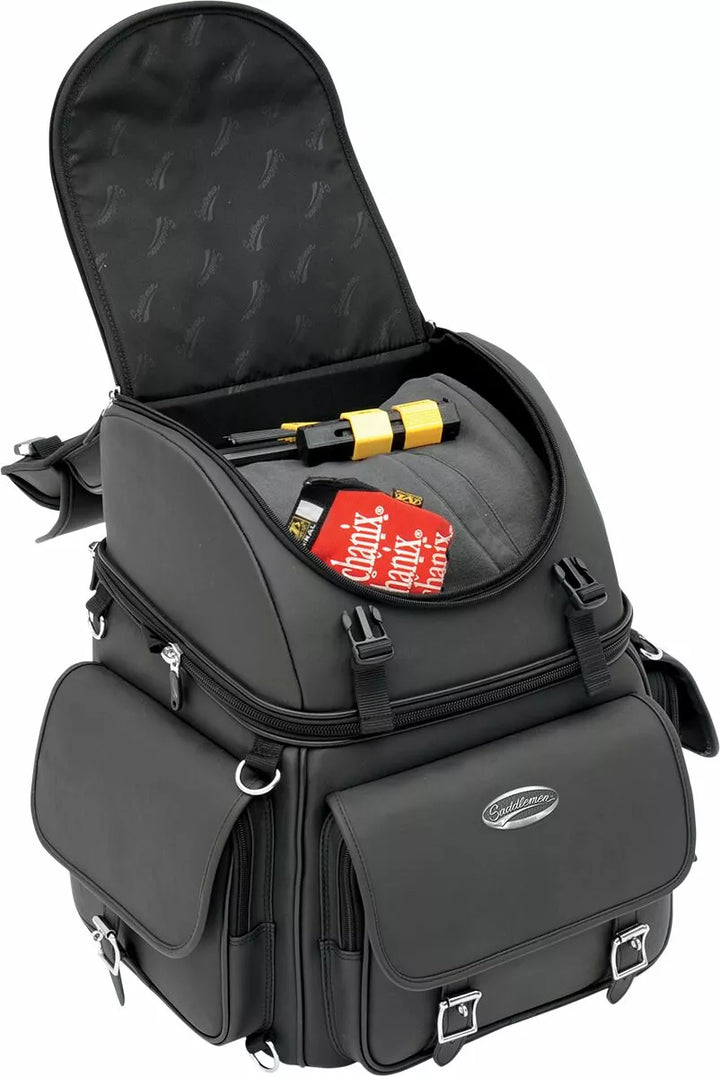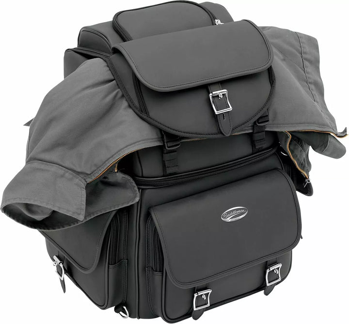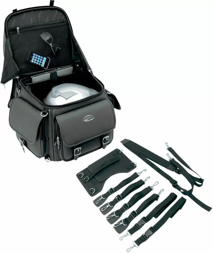 Rugowana mieszanka skórzanych materiałów wygląda świetnie na każdym rodzaju motocyklu, sztywna wewnętrzna struktura jest wystarczająco mocna, aby się pochylić, nawet gdy jest pusta, nie wymaga sissy batonika, dwie systemy montażowe, które do siedzenia motocyklowego, stojak na bagaż lub sissy baton, w tym plecak plecak może być dostosowany do dodatkowego komfortu dla pasażera lub dysków, solidne uchwyt Grip, obejmuje wyłączalne paski backpak Komora główna z górnym ładunkiem, wiosłowana komora do przechowywania pasuje do małego laptopa, cztery zewnętrzne kieszenie i pięć wewnętrznych kieszeni siatkowych, łatwe w użyciu bojowe klamry na każdym pasku, ozdobne chromowane klamry zapewniają styl, deszcz z zabezpieczającą tetber dostosowaną do kurtki, mini-padlocki dla bezpieczeństwa (dodatkowe klawisze) Pojemność;