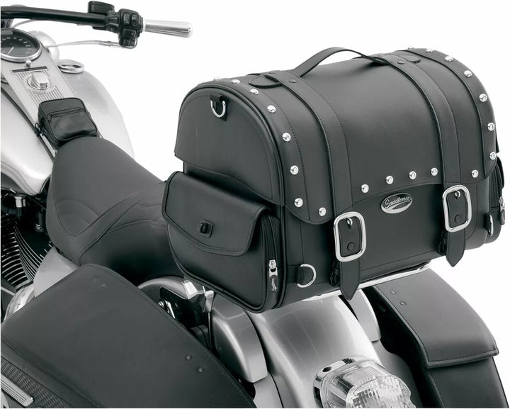 Elegancka torba z tylnymi paskami, kołki i duże chromowane klamry, zamknięte, szybkie klamry ukryte poniżej dużych chromowanych klamrów, wykonane z wytrzymałego skórzanego ziarna, odpornych na pogodę saddlehyde ™ i plastikowe panele wzmacniające puste, zaprojektowane do wielu opcji montażu, które można dostosować do każdego roweru; Podłącza się do Sissy Bar, Rack lub na szczycie siedzenia pasażera, łatwy w użyciu pasek Sissy Bar; Wiele punktów kotwicy, w tym cztery ciężkie chromowane D-ring i kilka gniazd pasków dla szybkiego, łatwego montażu, promieniowania górnego uchwytu i zdejmowanego paska na ramię dla wygodnego transportu z roweru, kieszonka w stylu Hat-box Protte Easy-Open Lid zapewnia wygodny dostęp, dwa zamykane i zamykane boczne kieszeń z boczną kieszenią w części Wiszą x 12½ "h: 19" l WH pow "